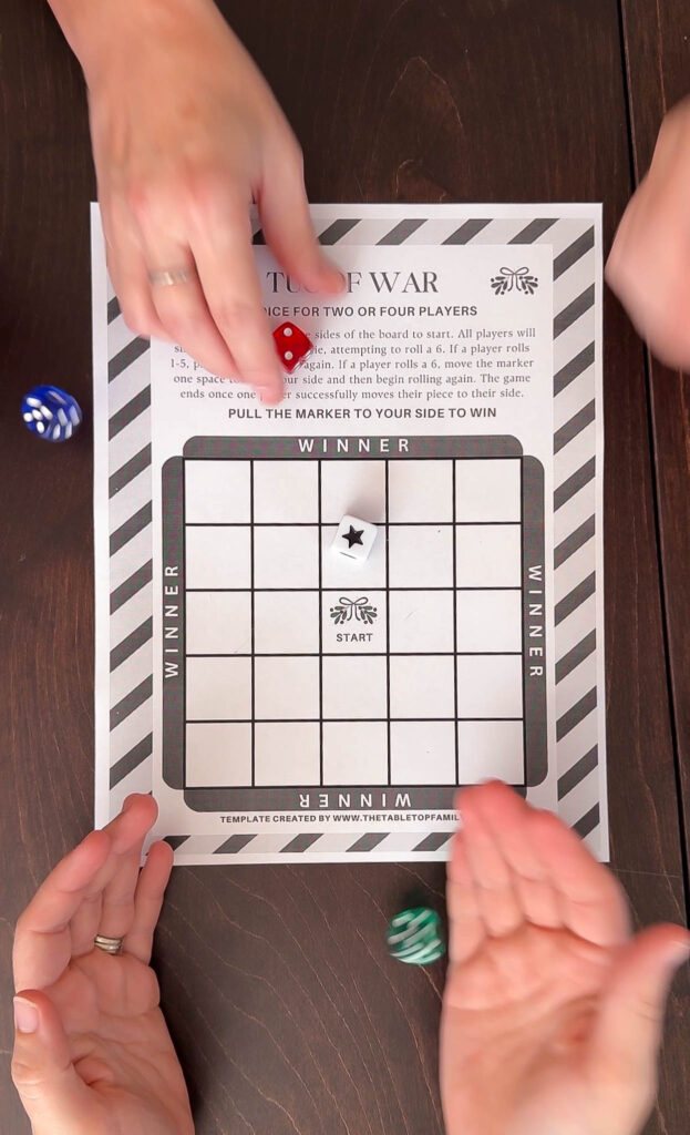 Tug of War Dice is one of those easy, fast, everyone-wants-a-rematch style games that works with kids, teens and adults. All you need is one die per player and a small marker or token. It’s the perfect mix of luck, suspense, and lighthearted competition that always gets people laughing.