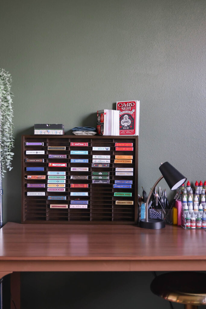 There are a few holes in the back of the organizer so it can be hung on the wall, but for right now, I have it propped up on our bookshelves in the game room. This thing is surprisingly heavy with all the decks of cards filling it up. One day I plan to hang it on the wall, but I can’t decide exactly where it should go, especially thinking if we ever fill it and start on a second case, I’ll want there to be plenty of space for a second organizer.