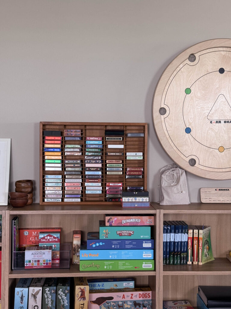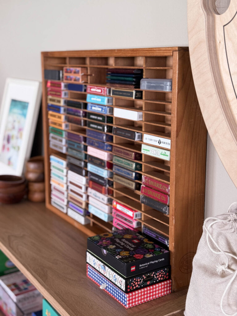 I love how this functions for playing card storage. The decks are all visible, easy to organize, and best of all, simple to get out and play. Our decks are not “collectors” decks, they definitely get used (sometimes abused with one too many intense games of speed or spoons) but I love the well-loved look they get, a sign of all the memories made. We’ve even started collecting decks when we travel to new places which is such a fun way to bring back a souvenir from a trip.