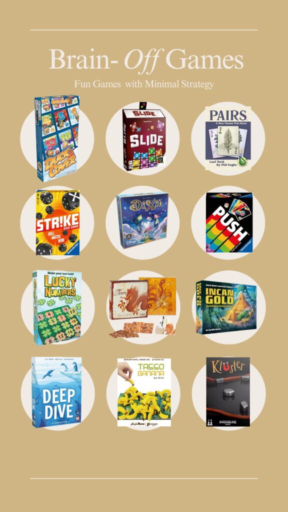 These games have simple rules, minimal strategy, and most have a good dose of luck — so you can enjoy playing without the stress of needing to strategize over every little decision.