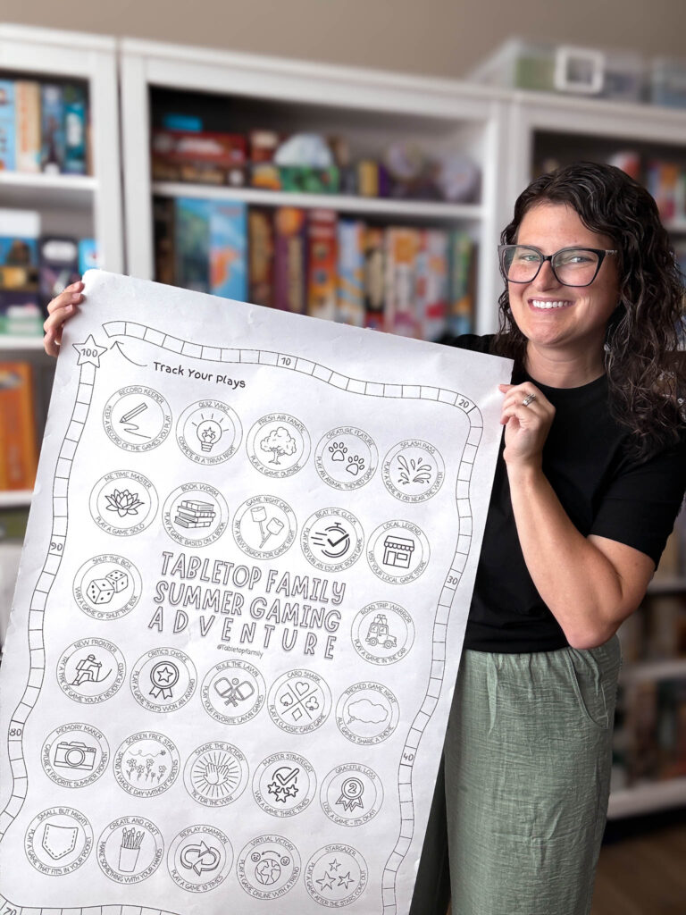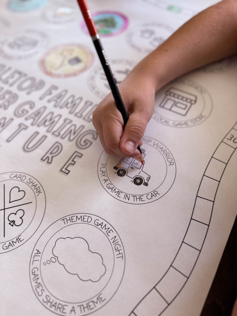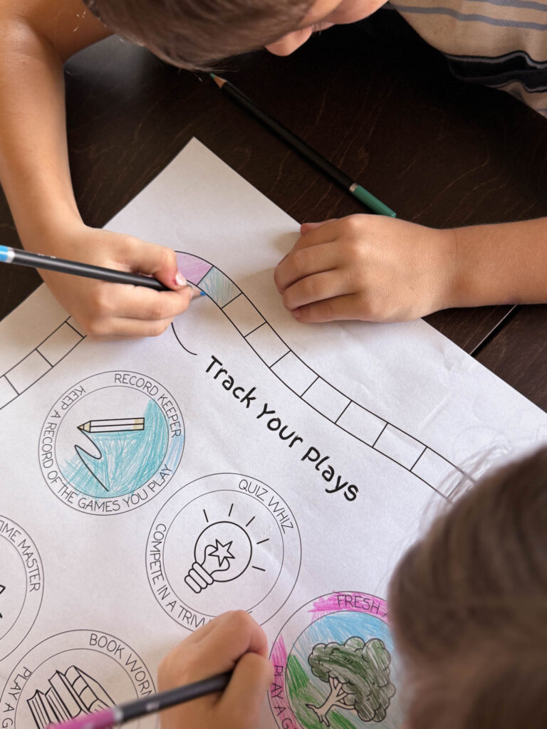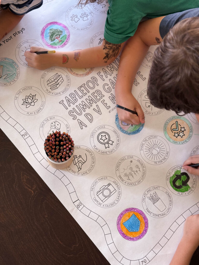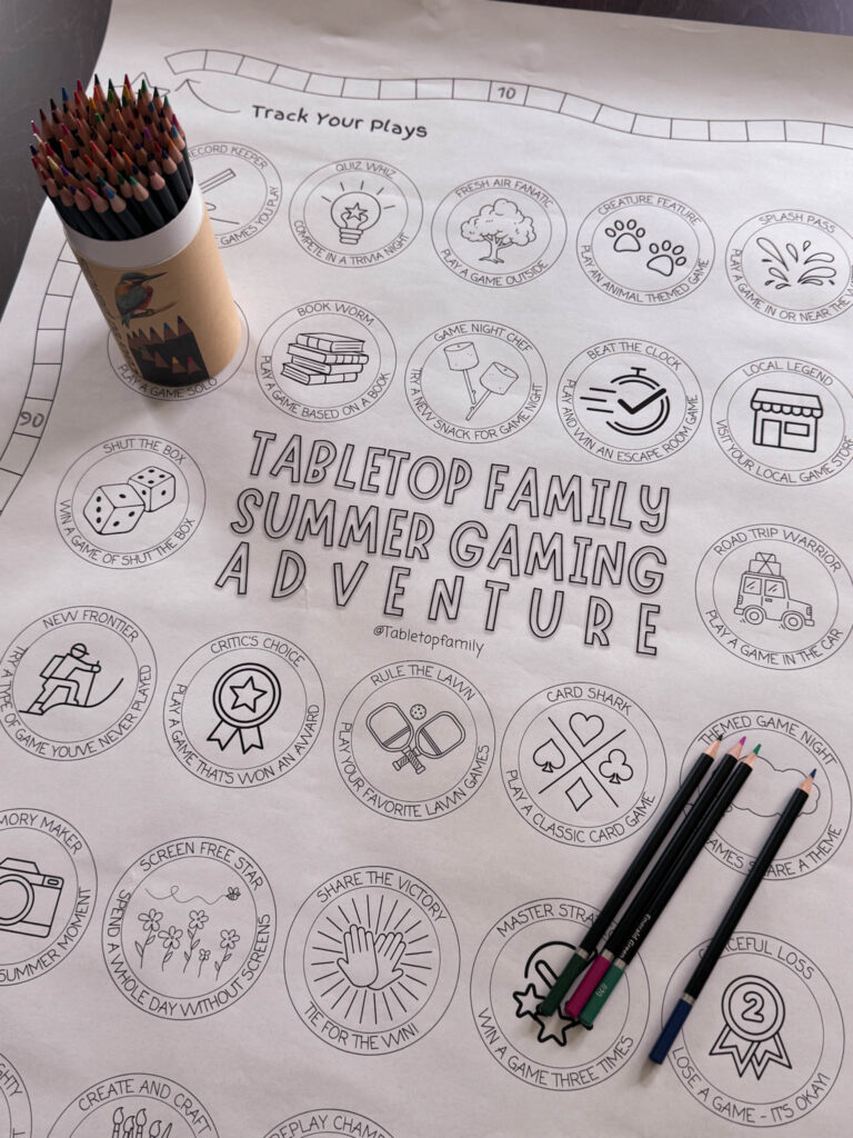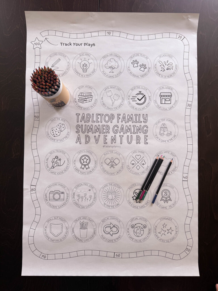 Every time your family completes a badge, you can color it in and watch your poster fill in with all the summer memories you’re making. Along the edge of the badges is a play tracker — each time you play a game, color in one of the spaces on the track. See if you can make it all the way to 100!